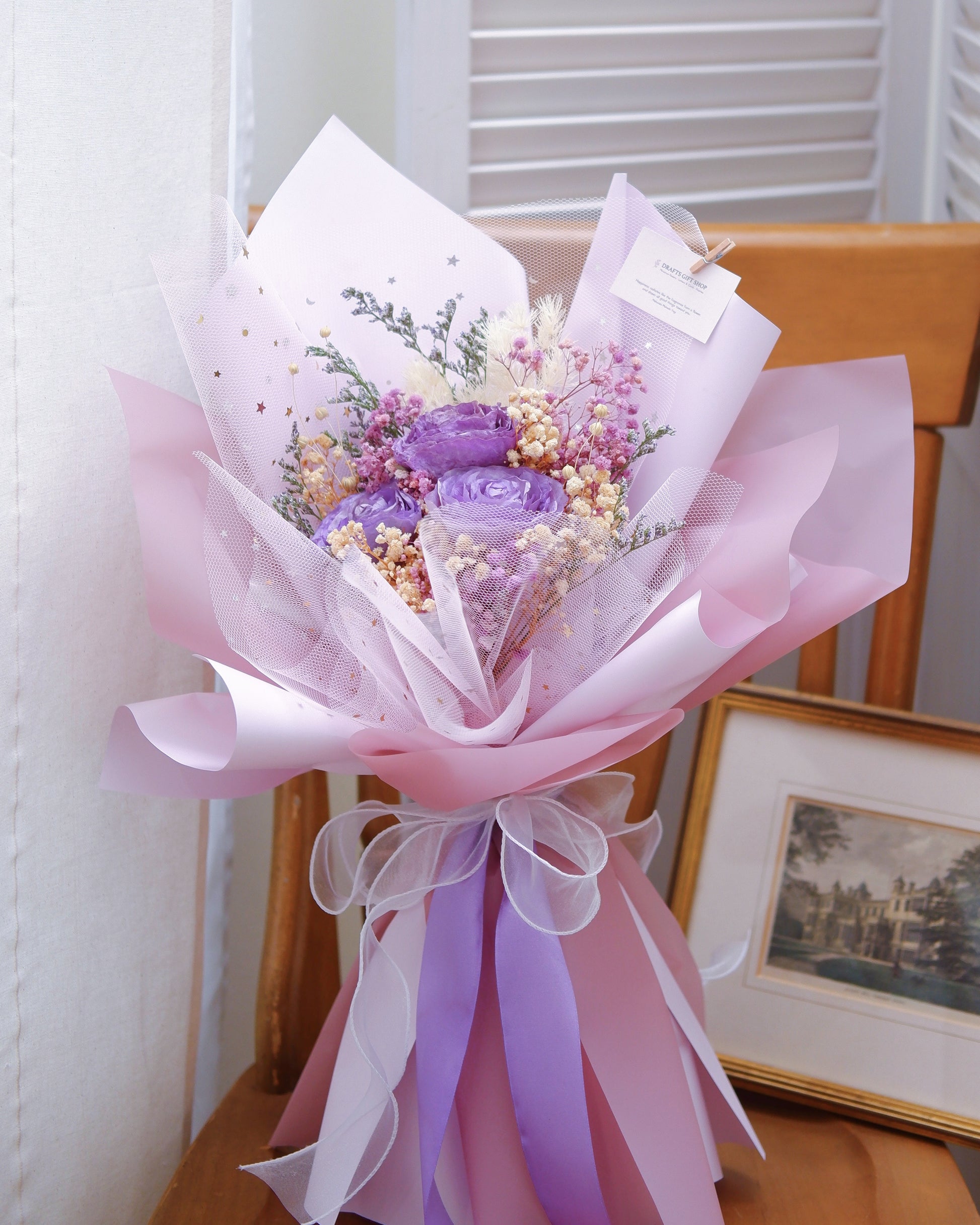 Make moments extra special with Beatrice, a best-selling bouquet featuring 2pcs. elegant purple fossilized roses wrapped in a rich purple theme. Its soft look makes it a perfect choice for birthdays, monthsaries, and moments that deserve something truly unforgettable.