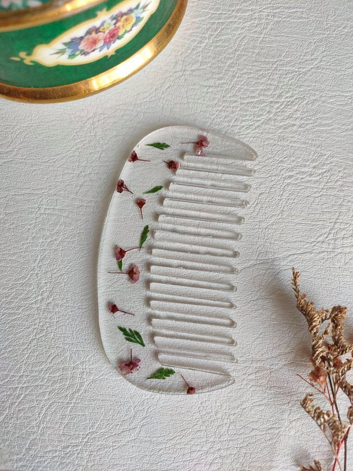 A handcrafted comb made out of real dried and preserved flowers and high quality resin.