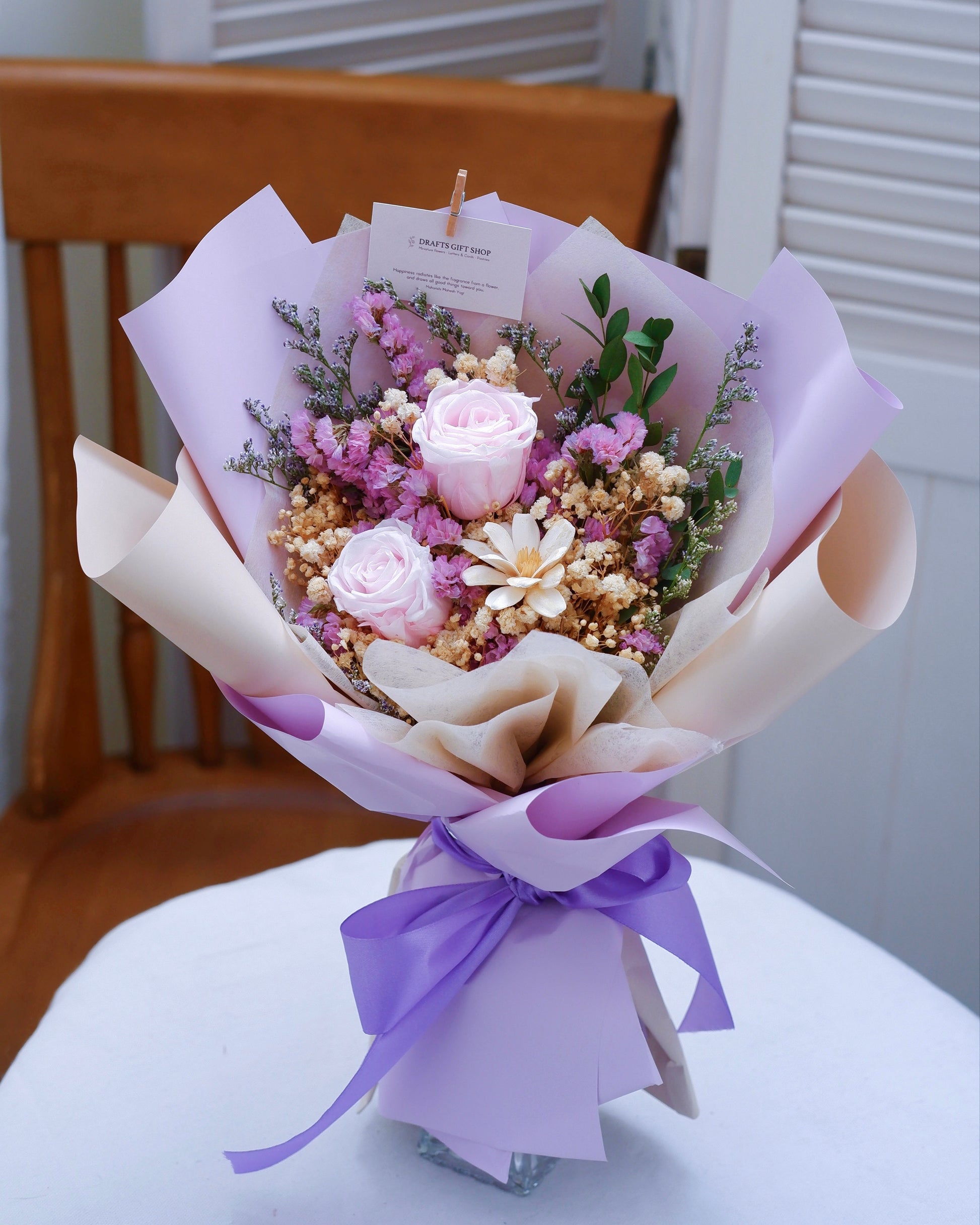 Sweet and feminine, the Cyrene bouquet features 2pcs. baby pink preserved roses paired with white and purple dried flowers, wrapped in charming purple. A lovely choice for birthdays, friendships, or simply sharing a touch of warmth and grace.