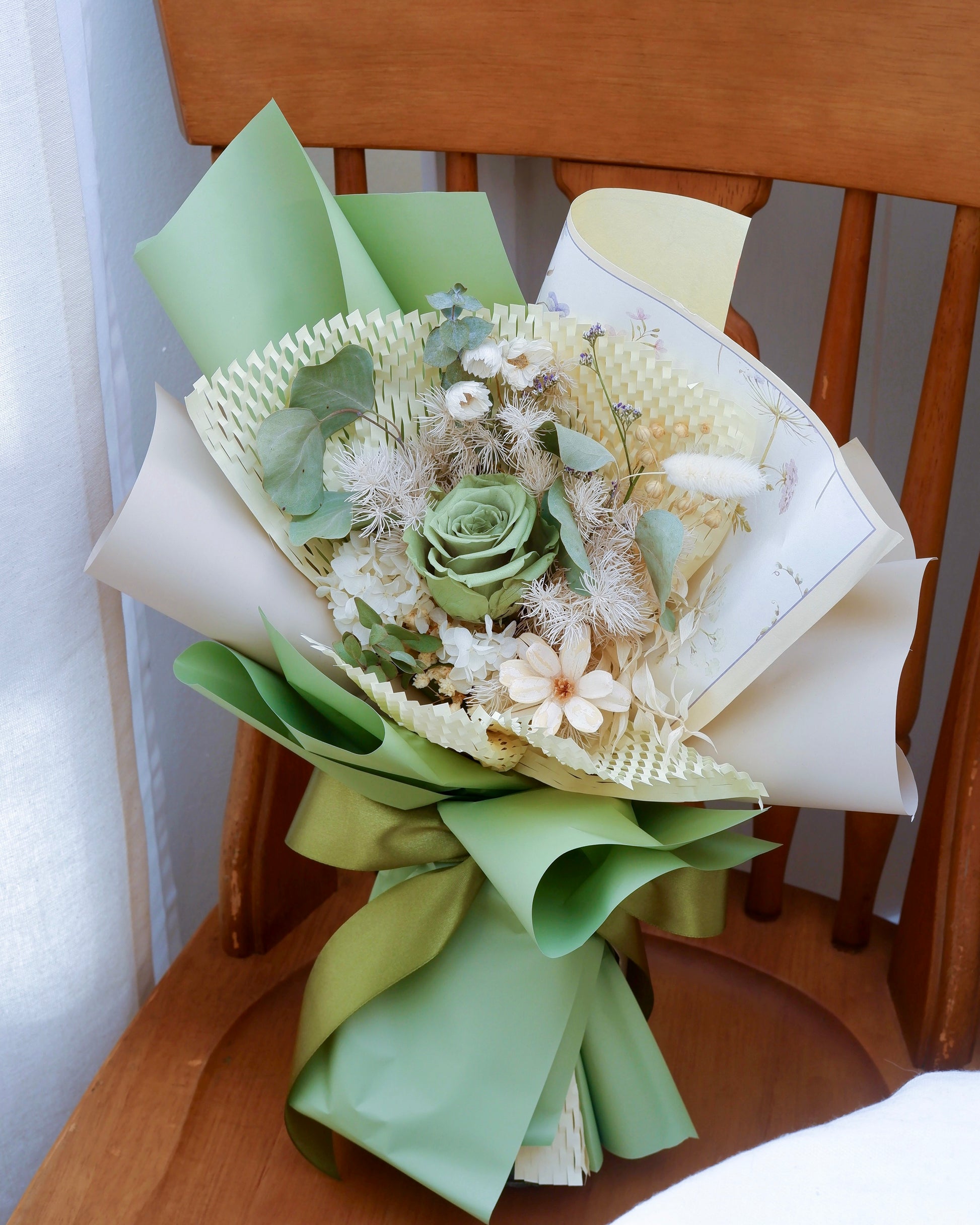 Delight someone special with the Eden petite dried flower bouquet featuring 1pc. preserved pastel green rose made perfect for matcha lovers who appreciate lasting beauty and calming elegance.