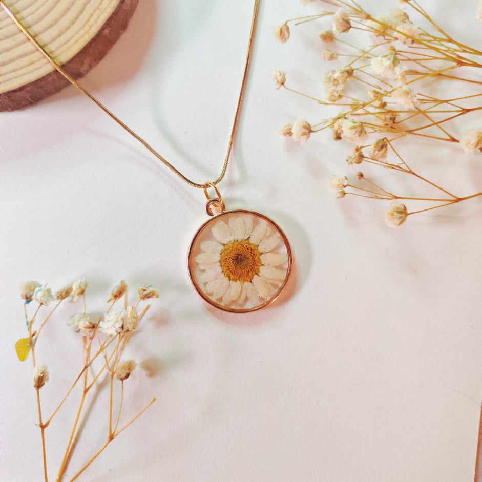 A handcrafted necklace made out of real dried and preserved flowers and high quality resin. The chain is approximately 20in long and non-tarnish.