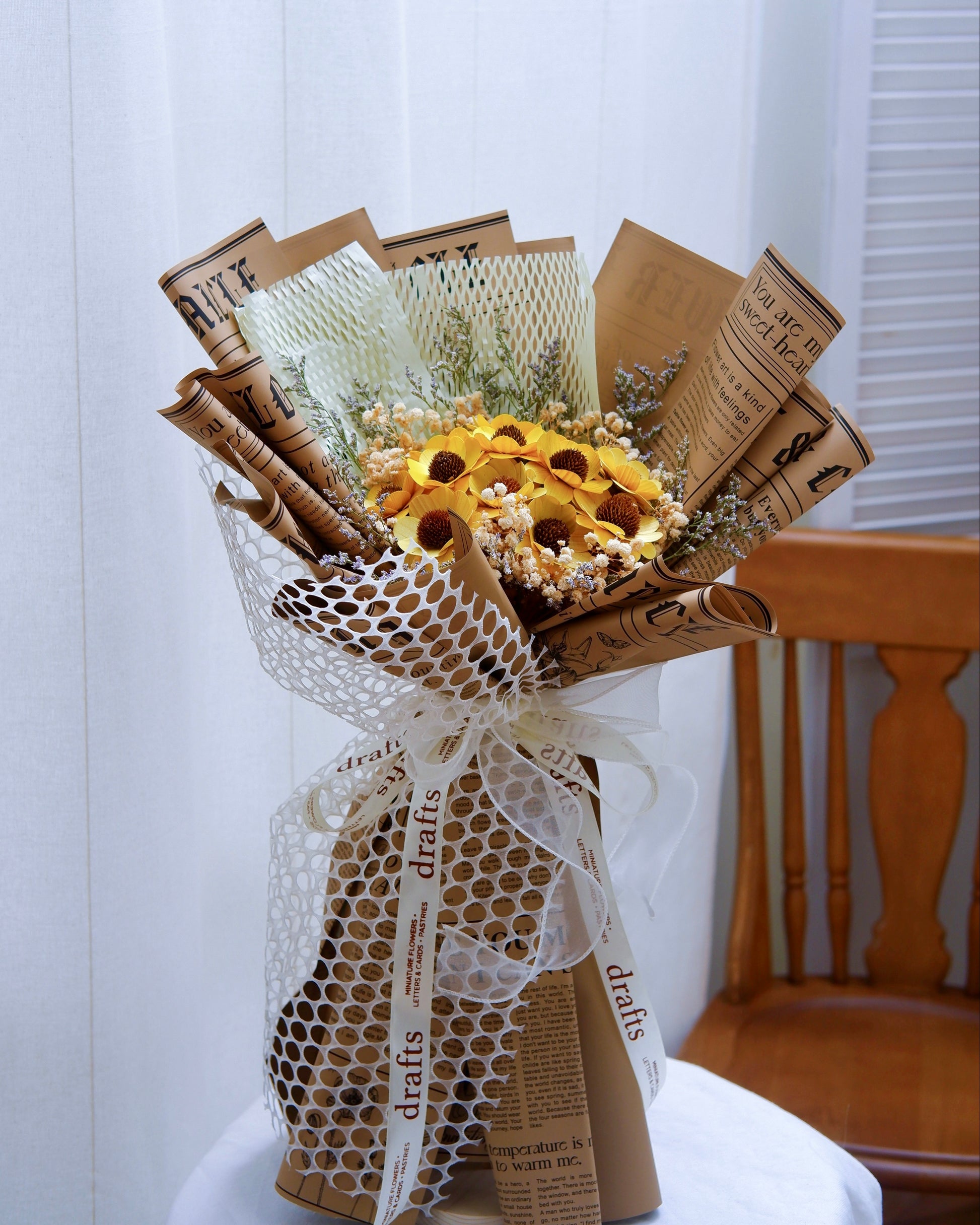 Bring sunshine to every occasion with Katherine, a lush bouquet of 12pcs. wooden sunflowers paired with baby’s breath and wrapped in rustic brown. Radiating warmth and nostalgia, this cheerful arrangement is perfect for heartfelt celebrations and meaningful surprises.