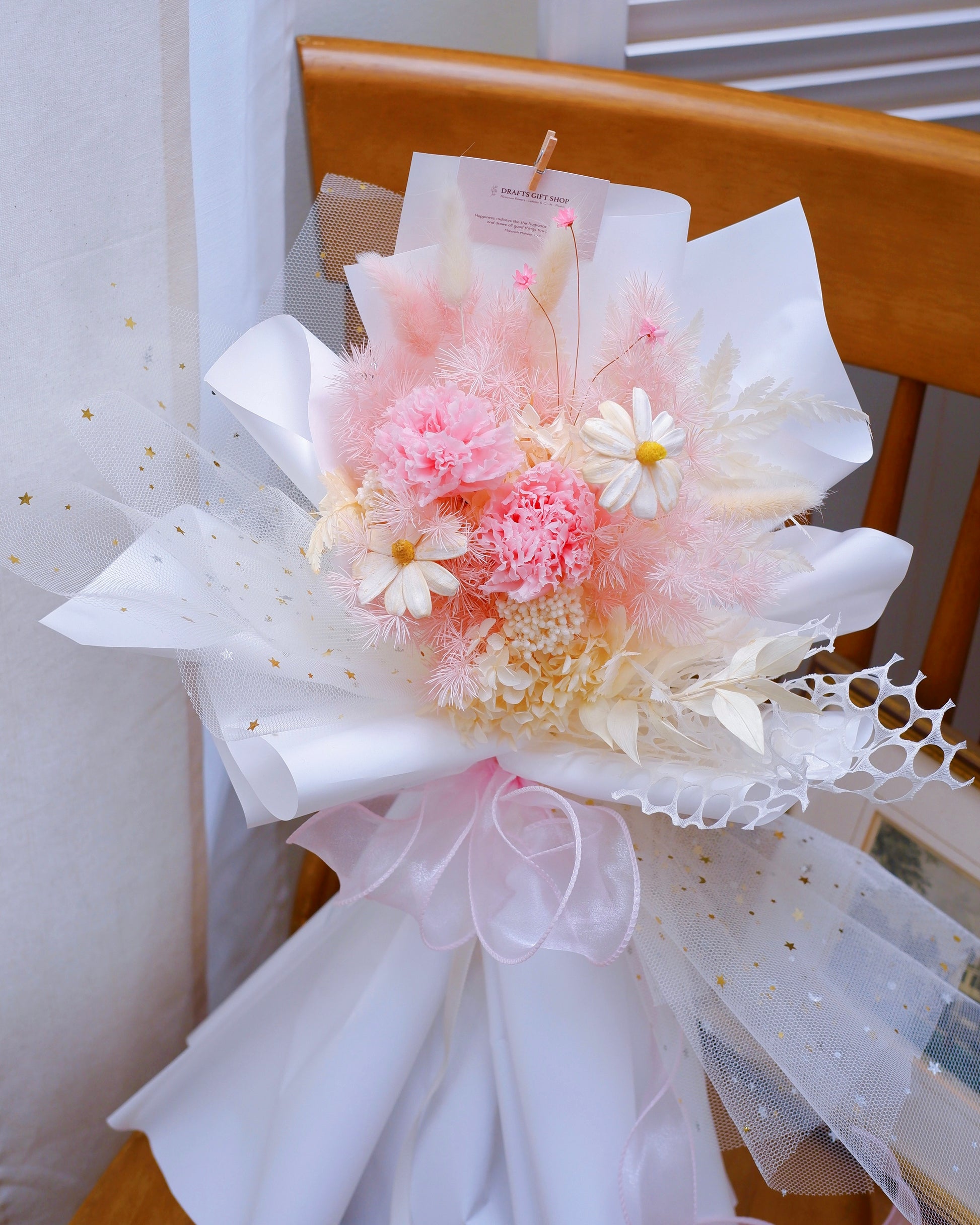 Brighten meaningful moments with Lorraine, a graceful bouquet featuring 2pcs. baby pink preserved carnations surrounded by soft white and pink blooms, wrapped in classic white. Its sweet and elegant look makes it a lovely choice for birthdays, anniversaries, and heartfelt surprises.
