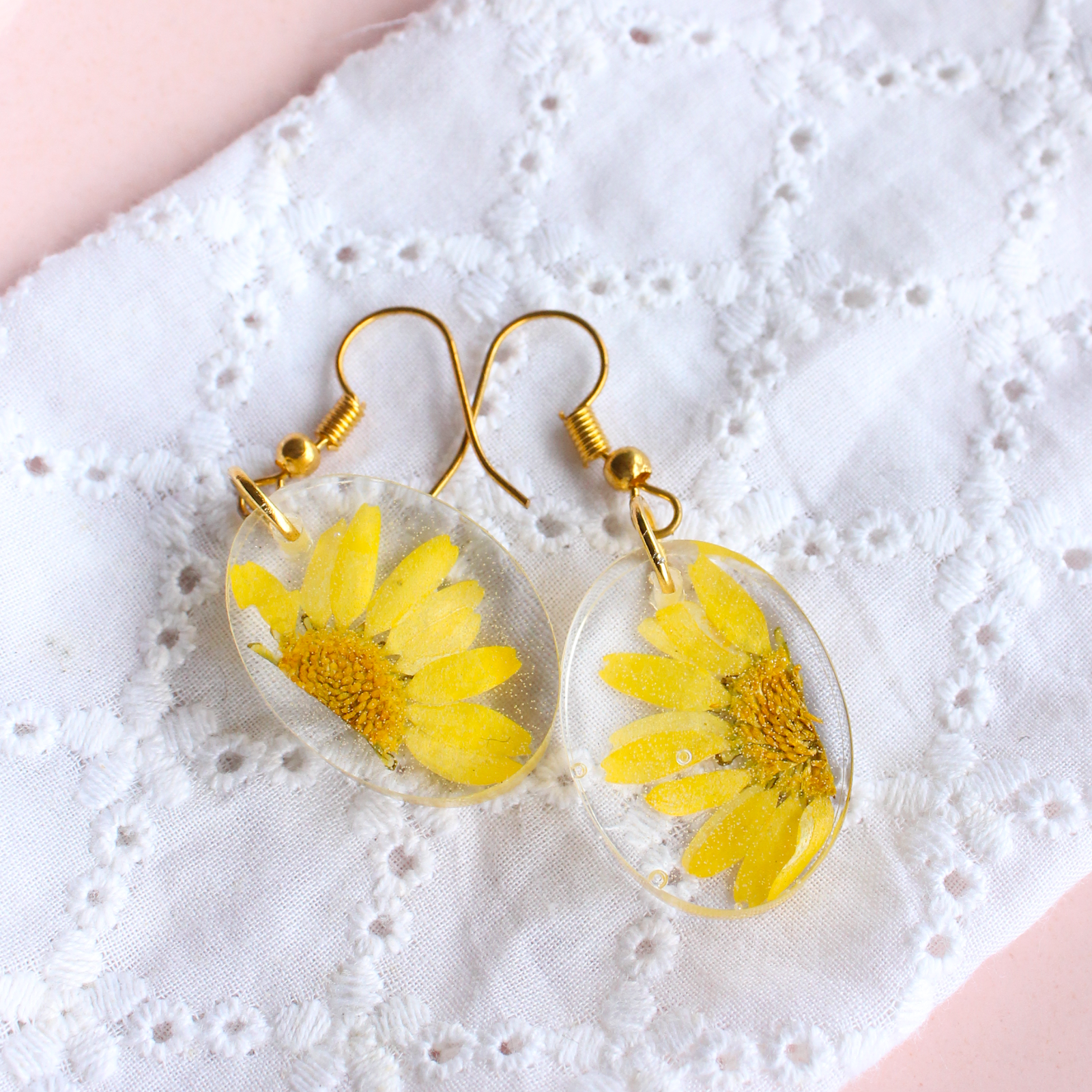 A handcrafted pair of earrings made out of real dried and preserved flowers and high quality resin.