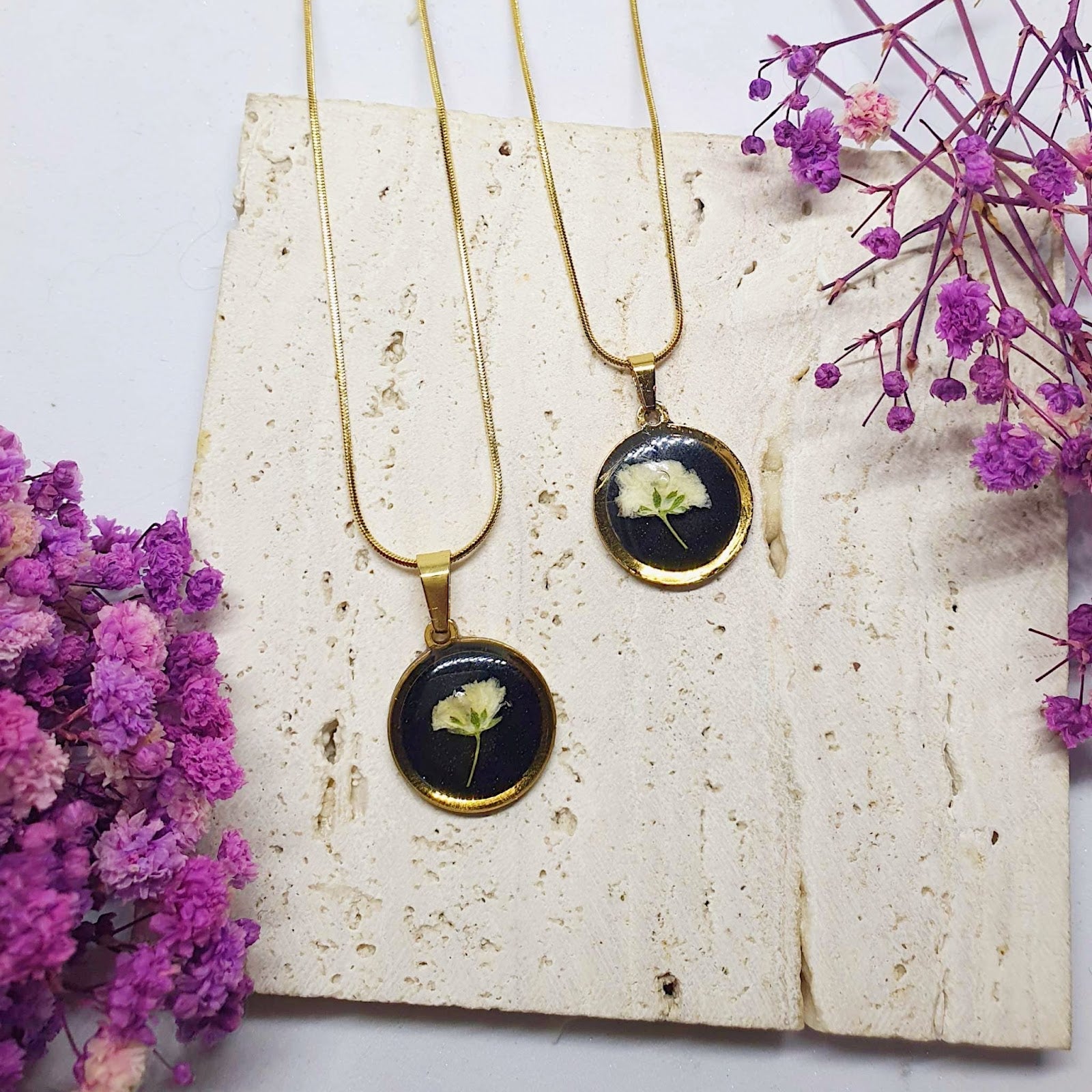 A handcrafted necklace made out of real dried and preserved flowers and high quality resin. The chain is approximately 20in long and non-tarnish.