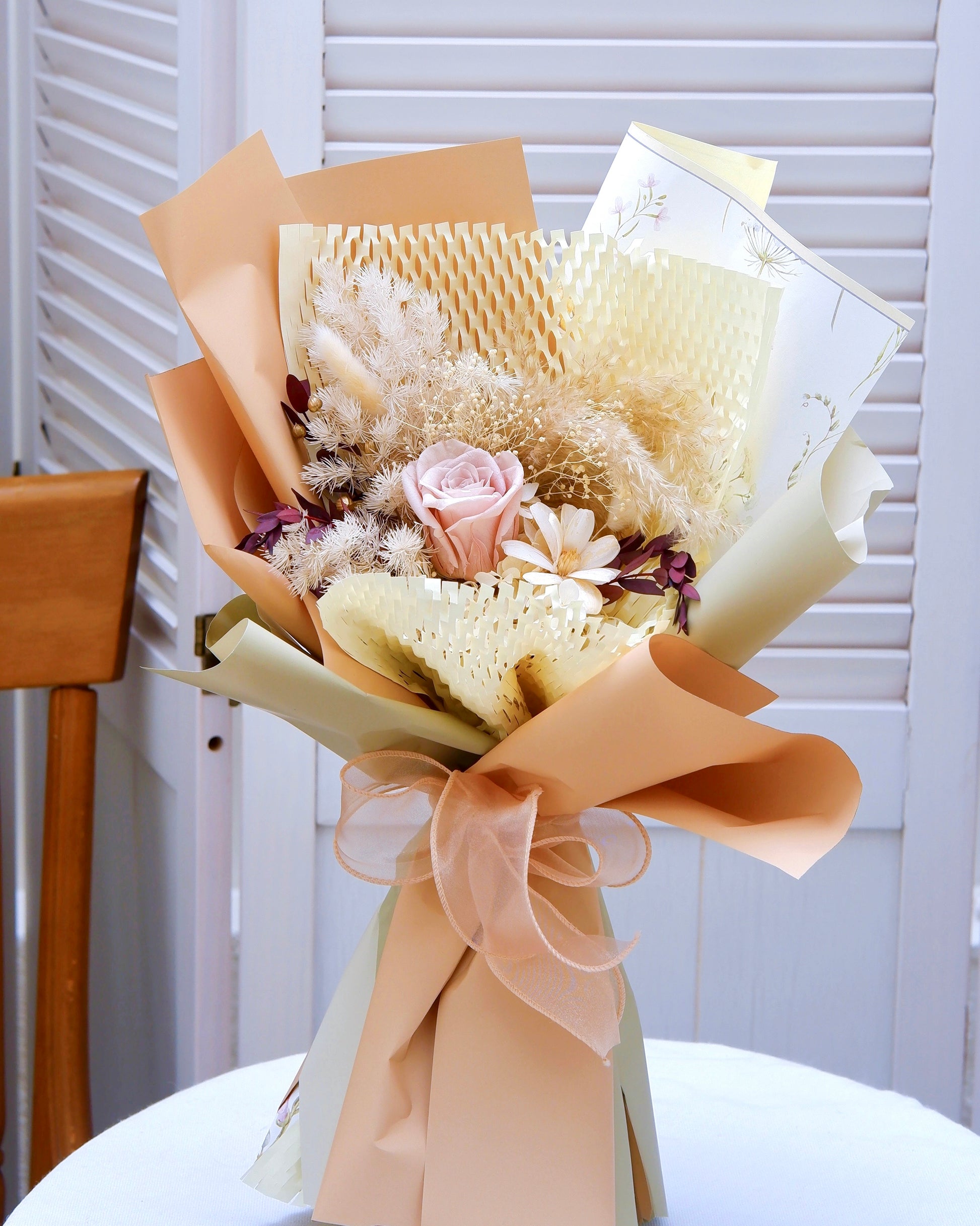 Refined and elegant, the Rory bouquet features a taupe preserved rose wrapped in soft beige with neutral-toned dried flowers. Its aesthetic, modern look makes it an ideal gift for men or anyone who appreciates timeless style and sophistication.