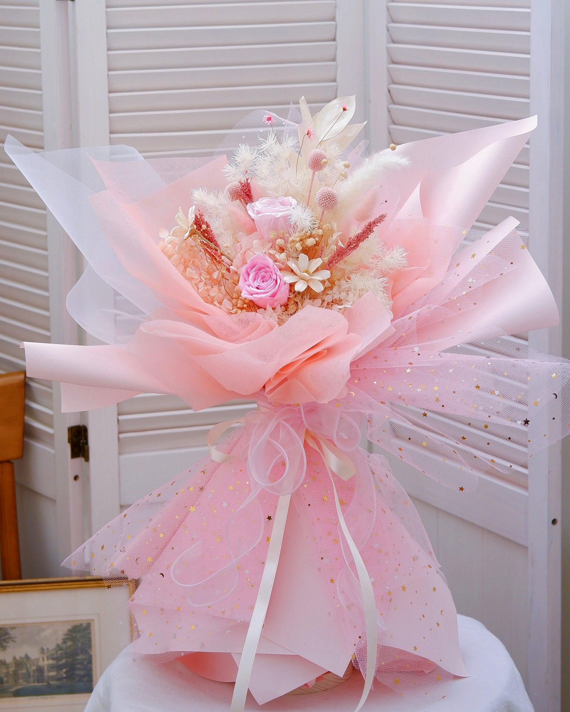 Celebrate love and elegance with Samantha, a lush bouquet featuring 2pcs. baby pink preserved roses surrounded by white and pink dried flowers, wrapped beautifully in pink. This charming arrangement makes every occasion brighter, from birthdays to anniversaries to heartfelt surprises.