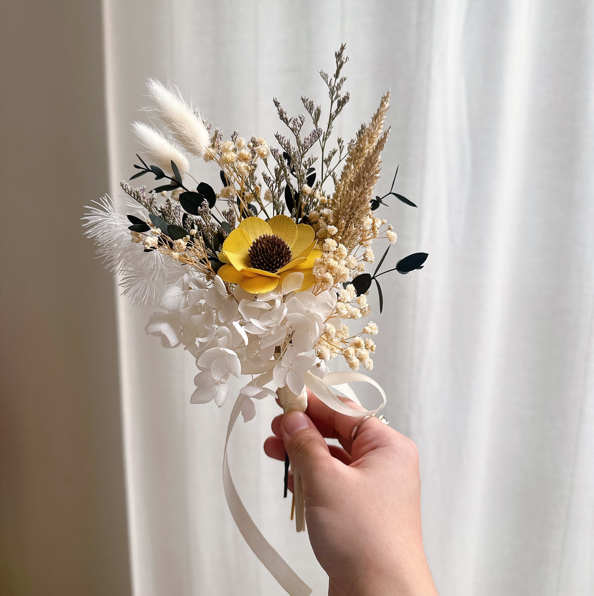 A heartfelt wooden sunflower paired with delicate dried blooms — a lasting tribute of love, warmth, and remembrance for your columbarium space.