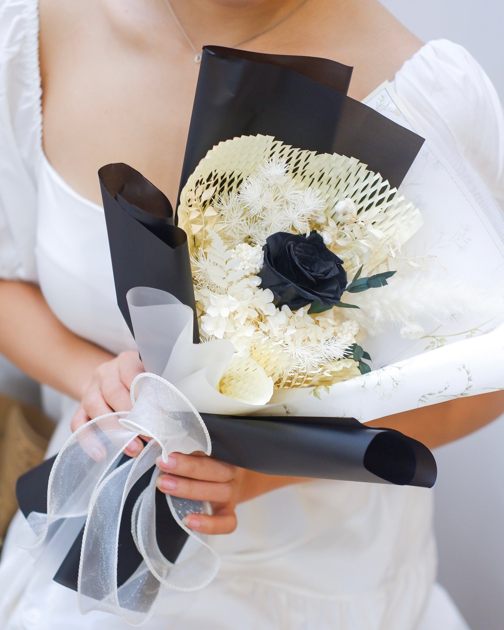 Confident and refined, Ysabel features a striking 1pc. black preserved rose wrapped in sleek black, highlighted by crisp white dried flowers. This petite bouquet is the perfect choice for men and women with strong, sophisticated personalities.